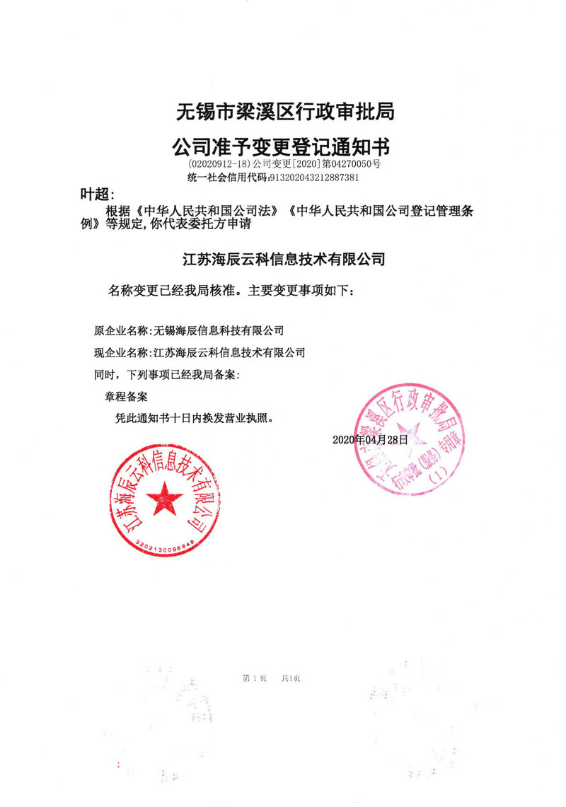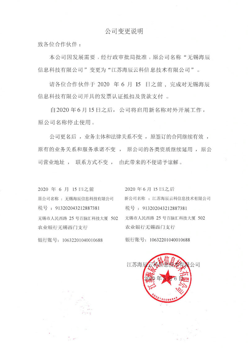 本公司因發展需要,經行政審批局批準,原公司名稱“無錫海辰信息科技有限公司”變更為“江蘇海辰云科信息技術有限公司”。