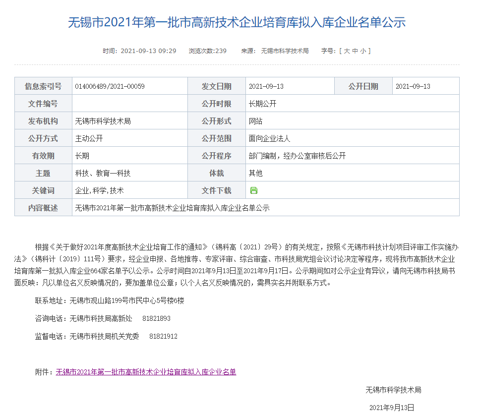 9月13日無錫市科學技術局網站發布了關于無錫市2021年第一批市高新技術企業培育庫擬入庫企業名單,經過層層推薦、評審、復核,江蘇海辰云科入選。